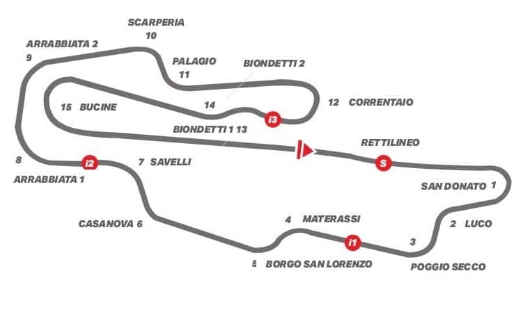 E' di proprietà della Ferrari dal 1988 ed è tra le poche piste che la FIA ha certificato con «la qualifica 3-Star Level: l'impianto ha infatti superato il test ambientale definito dalla Federazione, ottenendo così un riconoscimento per l'eccellenza delle politiche di sostenibilità adottate» fa sapere la scuderia. La pista situata sulle colline di Scarperia è lunga 5245 ed è formata da ben 15 curve, una più spettacolare del altra. Tante curve di media- alta velocità con un rettilineo in salita lunghissimo (oltre 1 km) dove le Formula 1 potranno sprigionare la potenza dello loro Power Unit. Un’altra caratteristica di questa pista che la rende molto spettacolare sono i continui dislivelli con una careggiata stradale piuttosto stretta come i circuiti anni 70-80.