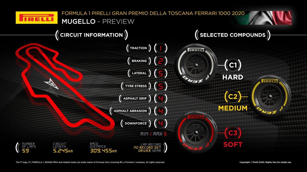 Pirelli per questo primo Gp del Mugello porterà in pista le tre mescole più dure: C1 Bianche, C2 Medie e C3 Soft. Questa scelta è stata fatta perché la pista è nuova e quindi non si hanno dati degli scorsi anni ma anche per le caratteristiche del tracciato che metteranno a dura prova gli pneumatici. Fondamentale per la scelta dei compound più duri è stato l’asfalto che è particolarmente aggressivo e impegnativo sugli pneumatici. È molto probabile che le temperature siano particolarmente elevate, visto che la gara si disputa nella seconda settimana di settembre: un'altra ragione per scegliere le tre mescole più dure della gamma, quelle più adatte a sopportare il degrado termico. Come ben sappiamo, i set di gomme a disposizione di ciascun pilota, sono stati fissati dal fornitore: ogni pilota potrà così fare affidamento su 8 soft, 3 medie e 2 hard. La Pirelli, per motivi organizzativi e di produzione, non ha più l’obbligo di annunciare la tipologia di mescole per ogni gara con anticipo: prima erano 9 settimane per gli eventi europei e 15 per quelli extra europei.