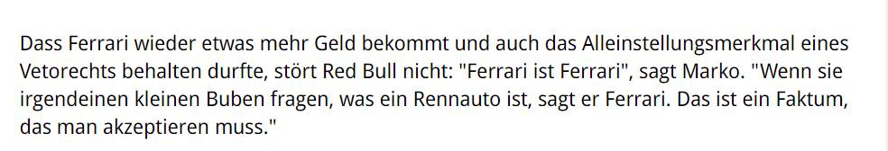 Helmut Marko è tornato a parlare della Ferrari, ma stavolta nessuna critica e nessun attacco come accaduto sulla questione del motore 2019. Quella del consigliere della Red Bull a motorsport-total.com è una presa di coscienza dopo la recente firma del Patto della Concordia e i vantaggi mantenuti da Maranello quanto team da sempre presente (dal bonus economico maggiore rispetto agli altri al diritto di veto). "La Ferrari è sempre la Ferrari – ha detto l'austriaco – se chiedono a un bambino qual è una macchina da corsa, dice Ferrari. E questo va accettato".