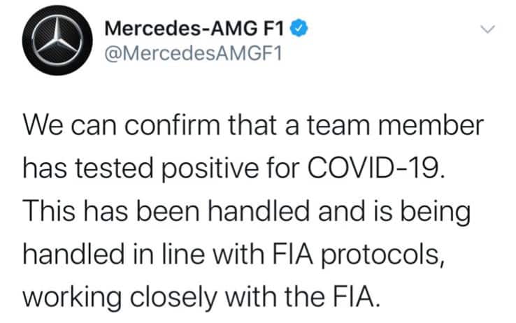Un positivo al Covid-19 nel team Mercedes. Ad annunciarlo è stato lo stesso team di Brackley. Il soggetto in questione non è uno dei piloti e attualmente si trova in isolamento. Il team guidato da sta seguendo i protocolli previsti dalla FIA in merito alla gestione e al contenimento degli eventuali casi di Coronavirus. "Possiamo confermare che un membro del team è risultato positivo al test per il COVID-19 - recita il post su Twitter -. Il caso è stato gestito e viene gestito in linea con i protocolli FIA, lavorando a stretto contatto con la Federazione".