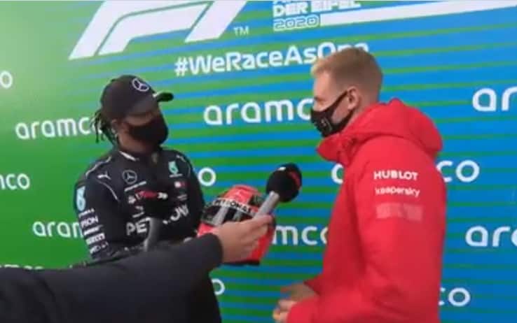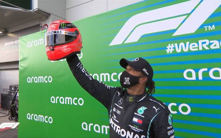 Momento stupendo al Nurburgring: Hamilton vince ed eguaglia il record di vittore di Michael Schumacher: 91. Mick, figlio del campione tedesco, regala a Lewis il casco del padre. Il britannico fa fatica a trattenere l'emozione: "Nemmeno nei miei sogni avrei pensato di raggiungere questo traguardo"