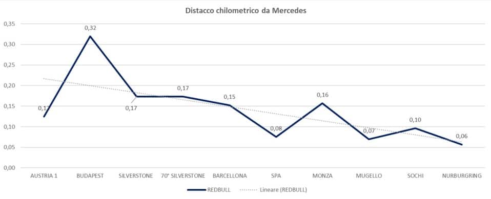 La Red Bull, gara dopo gara, si sta avvicinando sempre di più alla Mercedes (vedi grafico in basso). Questo avvicinamento è dovuto al fatto che il team anglo-tedesco, già da diverso tempo, ha abbandonato lo sviluppo della W11 per concentrarsi al 100% sulla monoposto del 2021. Questa decisione è stata spiegata alla stampa direttamente da Toto Wolff: "Non portiamo più aggiornamenti da ormai molto tempo. Abbiamo esaminato attentamente le conseguenze prima di prendere questa decisione, e pensiamo sia quella giusta. Non sempre ci si può permettere di terminare la stagione così anticipatamente. Penso che Red Bull stia sviluppando più velocemente di noi al momento. I frutti del loro lavoro emergono in modo progressivo, ma ad essere onesti è un copione già visto: non hanno mai avuto la nostra stessa forza nella parte iniziale del Mondiale. Non riesco a trovare un anno in cui abbiano iniziato a rilento, per poi essere molto competitivi alla fine. Quindi, se questa tendenza dovesse confermarsi, nelle ultime gare sarebbe davvero molto complicato per noi ottenere pole e vittorie".