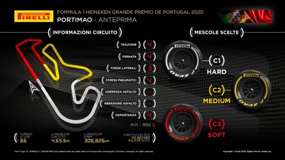 Il tracciato di Portimao è al debutto per un GP di Formula 1 e proprio per questo il costruttore di pneumatici ha fatto una scelta piuttosto conservativa, portando in pista le tre mescole più dure della propria gamma: C1 P Zero White hard, C2 P Zero Yellow medium e C3 P Zero Red soft. Nonostante non si sia mai corso, Pirelli ha comunque dei riferimenti grazie ad alcune gare GT.