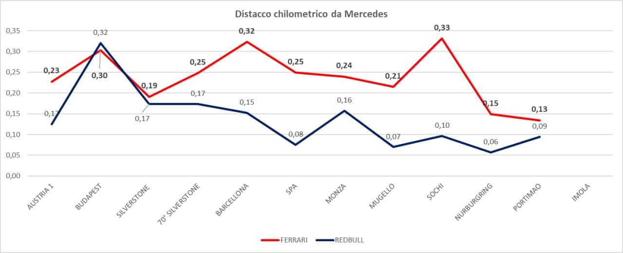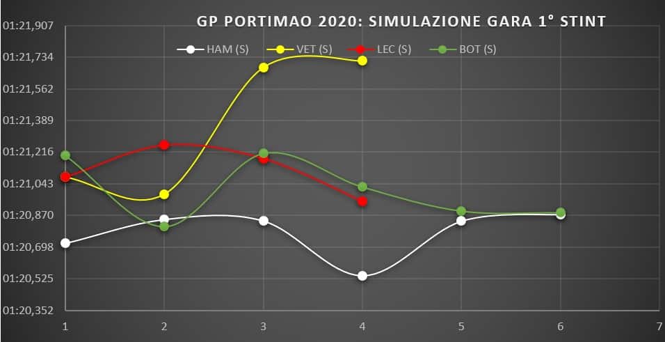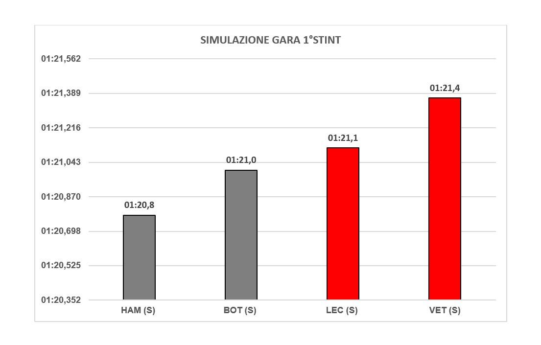 Non è dato sapere il carico di benzina ma i dati dimostrano che mai la SF1000 era stata così vicina alla W11 anche sul passo gara.