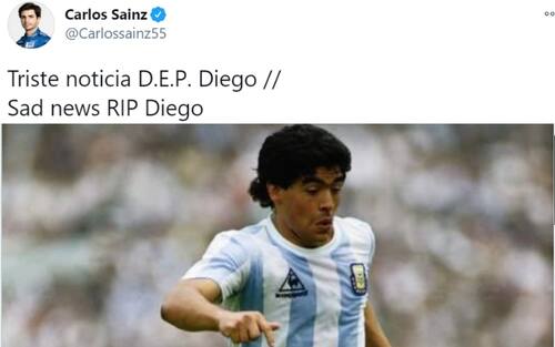 CARLOS SAINZ - Maradona palla al piede con la maglia della Selección e un messaggio "Rip Diego", sull'account Twitter di Carlos Sainz.