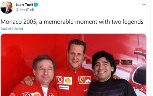 JEAN TODT - Il presidente della FIA, dopo un primo messaggio di cordoglio, ha successivamente postato una foto del 2005 a Monaco, con Diego Armando Maradona e Michael Schumacher. "Un momento memorabile con due leggende"
