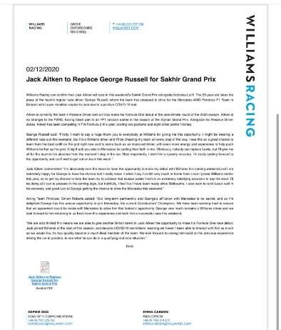 La notizia del passaggio di Russell in Mercedes per la gara del Sakhir è stata ufficializzata da un comunicato della Mercedes preceduto da un tweet di Toto Wolff, team principal della scuderia campione del mondo. Russell, che sulla Mercedes ha già girato in alcuni test, come detto ha l'occasione di mettersi in mostra con uno sguardo al futuro, dato che in passato era stato già ipotizzato un suo passaggio nel team di Brackley. "Nessuno può sostituire Hamilton - è il commento dello stesso Russell sui propri canali social - ma darò il massimo in sua assenza".