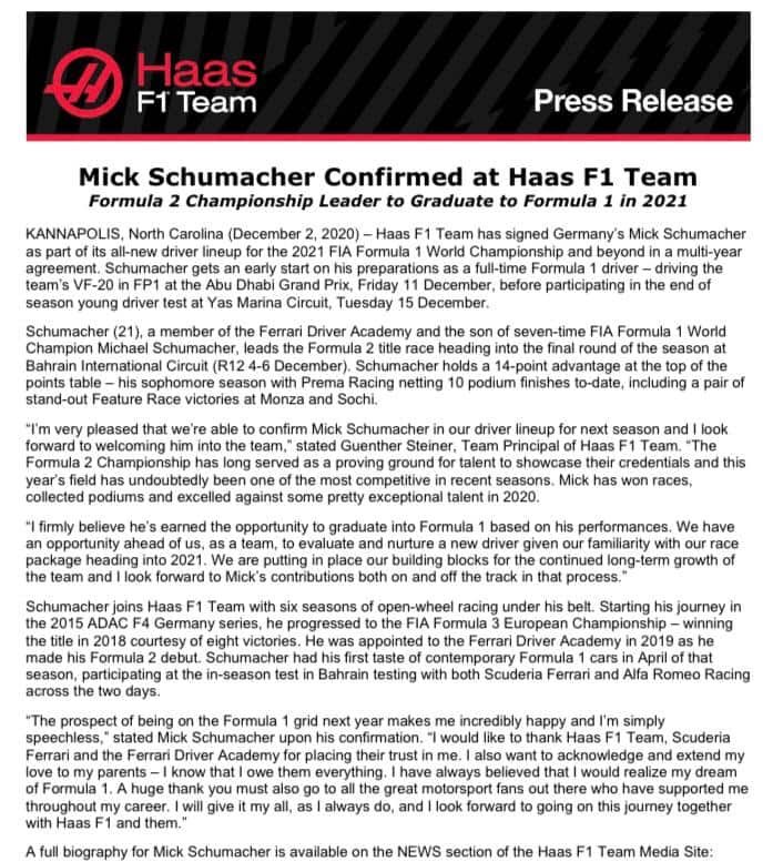 Schumacher viene ufficializzato all Haas il giorno dopo l'annuncio di Nikita Mazepin. Il tedesco e il russo arrivano così a rinnovare del tutto la coppia di piloti della squadra statunitese che nelle scorse settimane aveva già chiarito la fine del rapporto con Romain Grosjean e Kevin Magnussen.