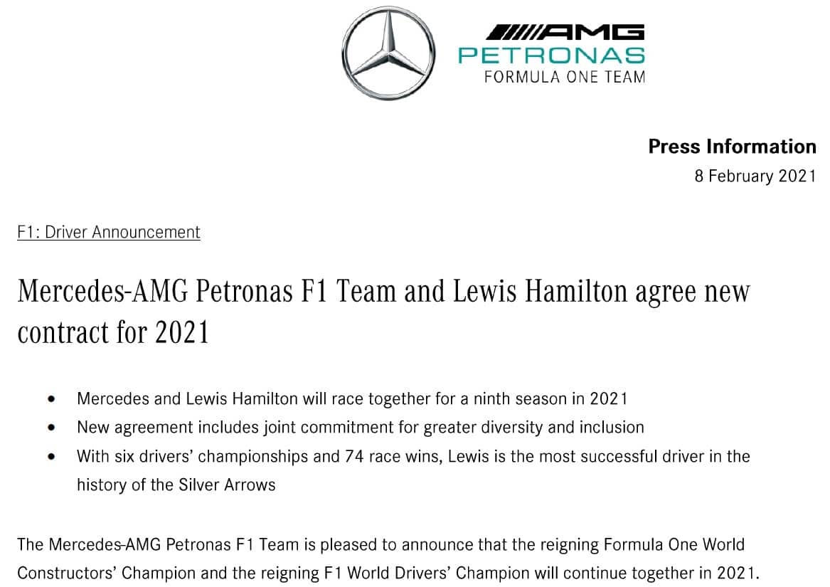 L'annuncio ufficiale della Mercedes inizia così: "La Mercedes è lieta di annunciare che continuerà a lavorare insieme a Hamilton nel 2021. Il team e Lewis hanno trovato l’accordo per un nuovo contratto, che vedrà proseguire per la nona stagione consecutiva una delle collaborazioni più vincenti nella storia dello sport".