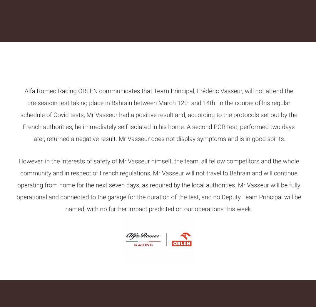 L'Alfa Romeo ha altresì fatto sapere che Vasseur è risultato negativo a un secondo tampone, ma in osservanza dei protocolli francesi e in attesa di una conferma definitiva sulle sue condizioni, si è immediatamente auto-isolato nella. Il dirigente sarebbe in buone condizioni ("è di buon umore")