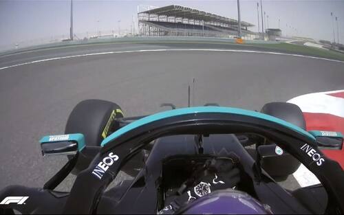 "Incontro ravvicianto" con Perez, al debutto sulla Red Bull. E' l'ultimo vincitore di sul tracciato di Sakhir (lo scorso anno con la Racing Point)