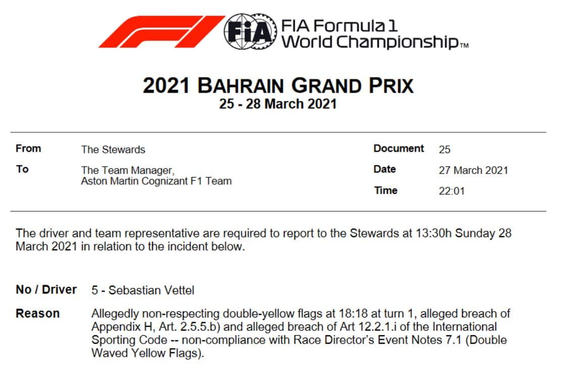 Ulteriore beffa per Seb in serata: Vettel è sotto investigazione per non aver rispettato le doppie bandiere gialle in Q1 in curva 1. Dovrà presentarsi domenica dai commissari, come si legge dal documento emesso dalla FIA.