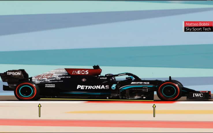 Il rake è il differenziale di altezza tra asse anteriore e asse posteriore della vettura. Mercedes e Aston Martin 'viaggiano pari', ovvero con un fondo molto piatto. Ferrari è un po' più alta al posteriore, mentre la vettura più estrema è la Red Bull. La scelta del rake deriva dalle mappe aerodinamiche: il volume d'aria che passa sotto a una vettura viaggia a una certa velocità e quando arriva nella zona del diffusore, rallenta. Nelle vetture con un rake più pronunciato, l'aria viene estratta a una velocità maggiore e l'efficenza del diffusore è migliore rispetto a quelle con un rake basso. In passato ci si poteva sistemare con dei binari sul fondo: ora questi binari sono stati tolti e alcune vetture si ritrovano con una coperta più corta degli altri.