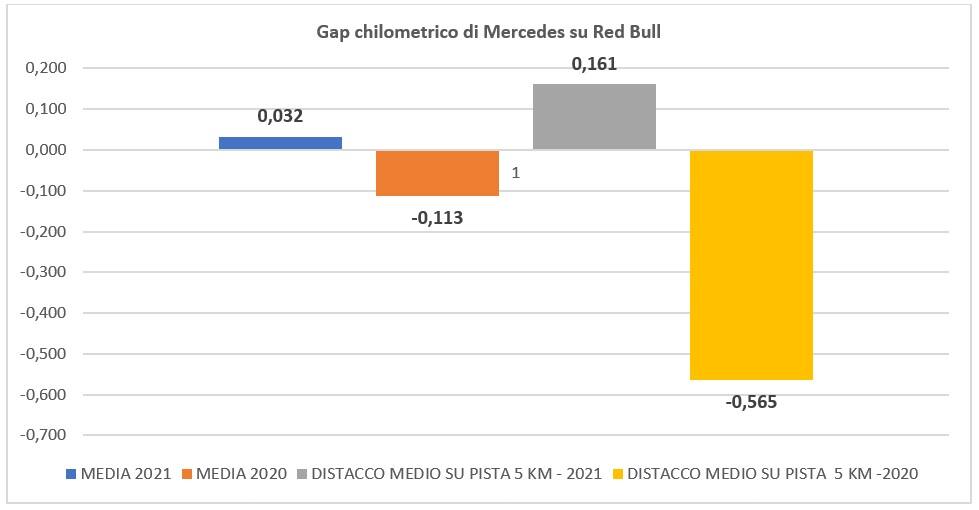 Dati alla mano la W12 è dietro a Red Bull di circa 32 millesimi al chilometro, ma questo dato è influenzato anche dall’errore commesso da Verstappen in qualifica. Se vogliamo dare un dato possiamo stimare una RB16B davanti alla W12 di circa 2 decimi su una pista di 5 km di lunghezza. Rispetto al 2020, Mercedes ha perso più di 7 decimi al giro su Red Bull. Si è passati da un vantaggio di oltre mezzo secondo al giro ad uno svantaggio di 161 millesimi. Gap piccolo ma che sarà difficile recuperare, anche a causa del budget cup e al fatto che tra qualche mese si inizierà a lavorare sulla vettura 2022.