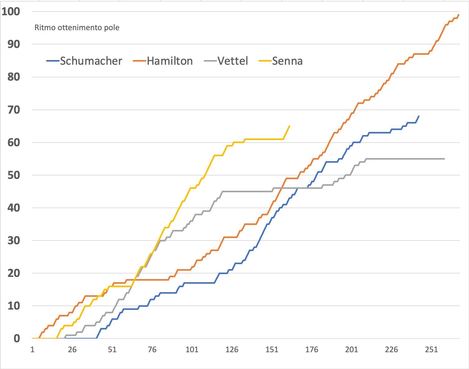 - Tanto più la linea di un pilota tende al verticale - come nel caso di Lewis Hamilton - tanto più è alto il suo ritmo di ottenimento delle pole nel corso della carriera.