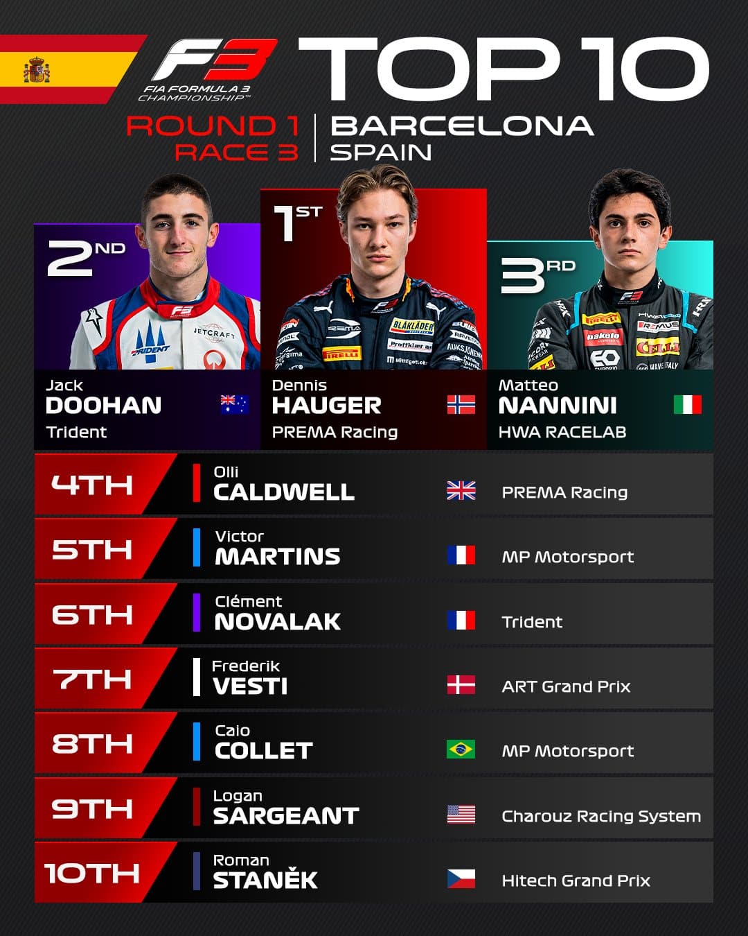 Il norvegese Dennis Hauger vince Gara-3 in Spagna e conquista la vetta della classifica piloti di Formula 3. Con lui sul podio Jack Doohan e l'italiano Matteo Nannini, terzo proprio come nella scorsa stagione.