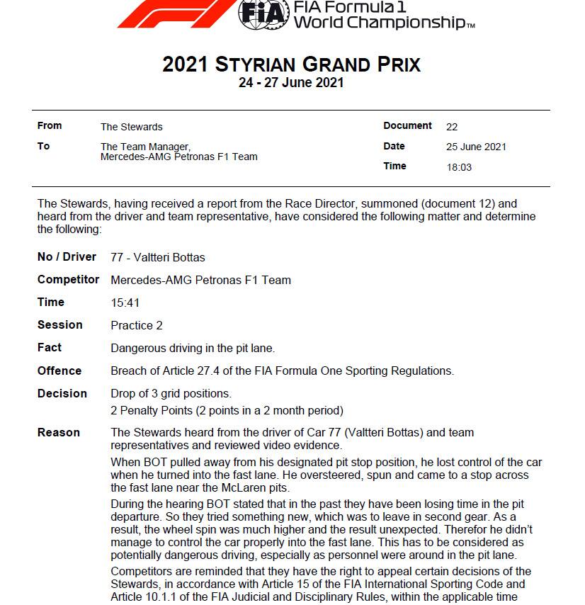 Valtteri Bottas è stato penalizzato di tre posizioni sulla griglia di partenza del GP di Stiria. Al finlandese della Mercedes è stato fatale l'errore durante le prove libere 2 uscendo dal box, con un pericoloso testacoda in pit-lane che è stato punito dai commissari. Bottas era è passato dalle gomme soft alle dure nella simulazione gara: quando ha accelerato per ripartire, ha perso il controllo della sua Mercedes, rischiando di travolgere i meccanici della McLaren. Oltre alla penalizzazione sulla griglia di partenza, il pilota Mercedes ha ricevuto anche due punti di sanzione sulla SuperLicenza. Subito dopo le libere, Bottas aveva dichiarato di non aspettarsi sanzioni.