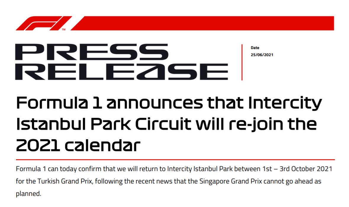 Cambia ancora il calendario della F1 2021 che segna un ritorno. L’Istanbul Park si prepara ad accogliere di nuovo il Gran Premio di Turchia che torna dopo l’esclusione di qualche tempo fa. Questa gara, che si correrà nel weekend dal 1° al 3 ottobre, arriva in sostituzione dell’annullato appuntamento di Singapore. "La F1 può oggi confermare il ritorno al circuito di Istanbul al posto della tappa di Marina Bay”, si legge in una nota della Formula 1.