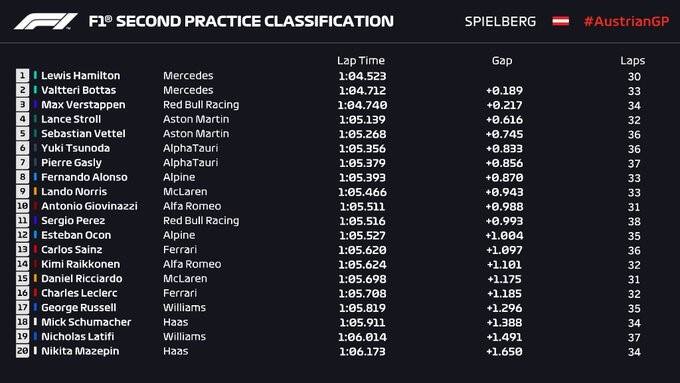 Al pomeriggio si è fatto un passo indietro e il comportamento della vettura è decisamente migliorato, infatti, il team anglo-tedesco ha piazzato i sue piloti al primo e secondo posto. Lewis Hamilton ha realizzato il giro più veloce con gomme soft fermando il cronometro sull’ 1:04,523 staccando Bottas di 189 millesimi. La Mercedes è stata la vettura più veloce in tutti i settori. Valtteri Bottas è stato l'uomo più veloce nel prima tratto di pista mentre nei rimanenti due ha primeggiato Hamilton. L’unico pilota a tenere il ritmo del duo Mercedes è stato Max Verstappen. Il pilota olandese ha ottenuto il terzo tempo ma l’impressione è che non abbia mostrato il massimo potenziale della sua RB16b visto che ha effettuato il giro con le soft quando aveva iniziato a piovigginare. Il pilota olandese fa “pretattica” e cerca di proteggersi dal ruolo di favorito: “Le Mercedes sembrano abbastanza veloci con le mescole morbide. […]. Non vedo grossi problemi, dobbiamo solo assicurarci di avere un po' più di ritmo con la gomma morbida, perché mi sembra che con la media e nei long run siamo messi bene”.