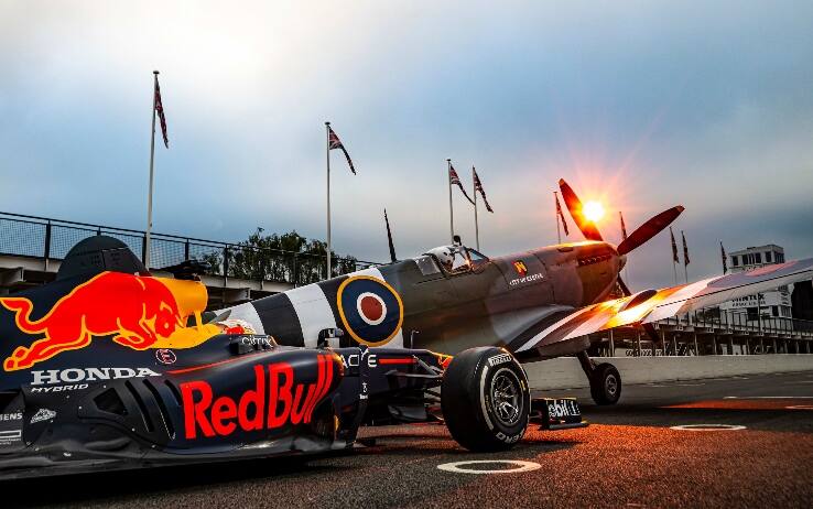 F1, Verstappen e la sfida contro storici mezzi inglesi: dal bus a due piani allo Spitfire