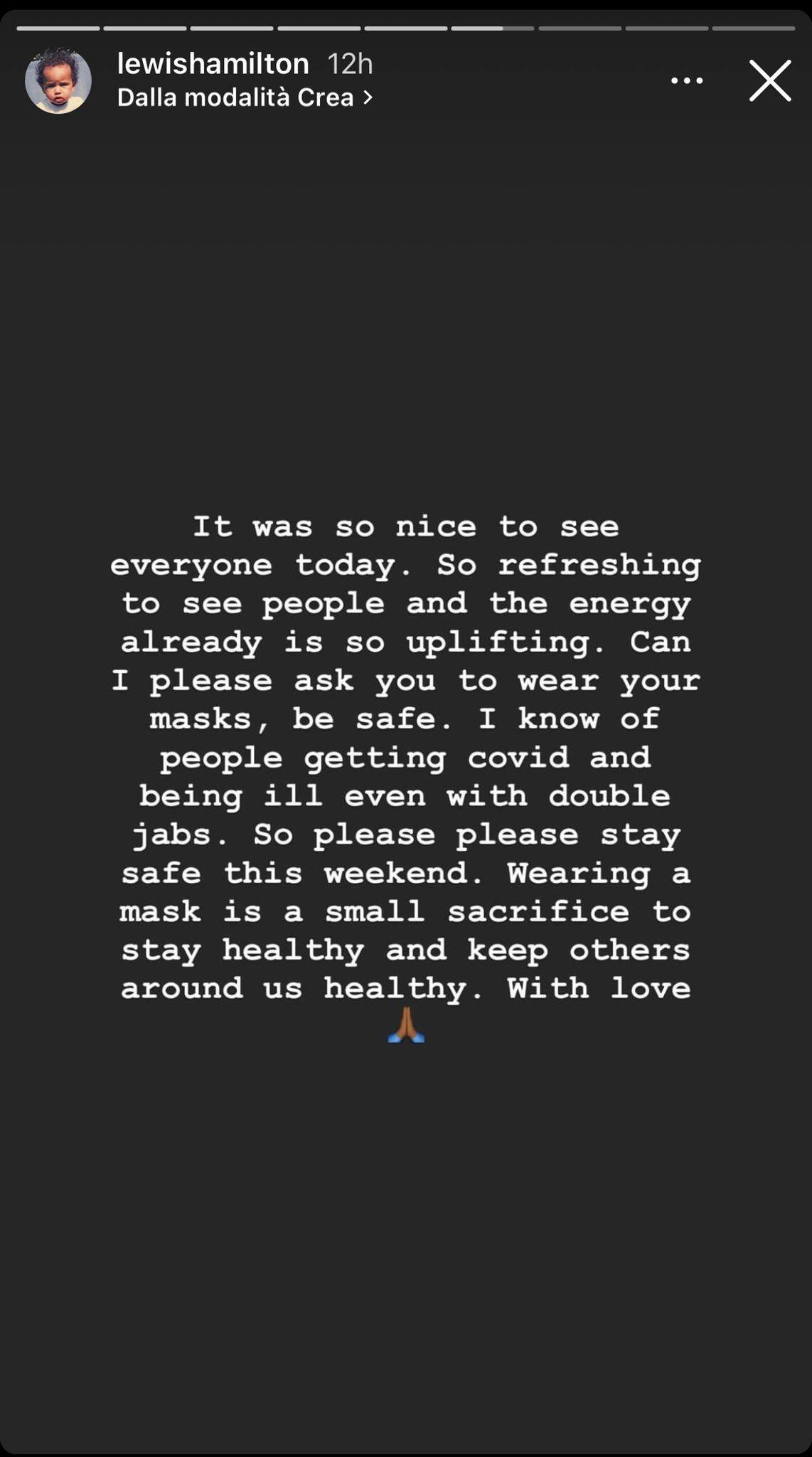 Su Instagram, Lewis Hamilton ha invitato alla prudenza e al buon senso il pubblico: "Usate le mascherine".
