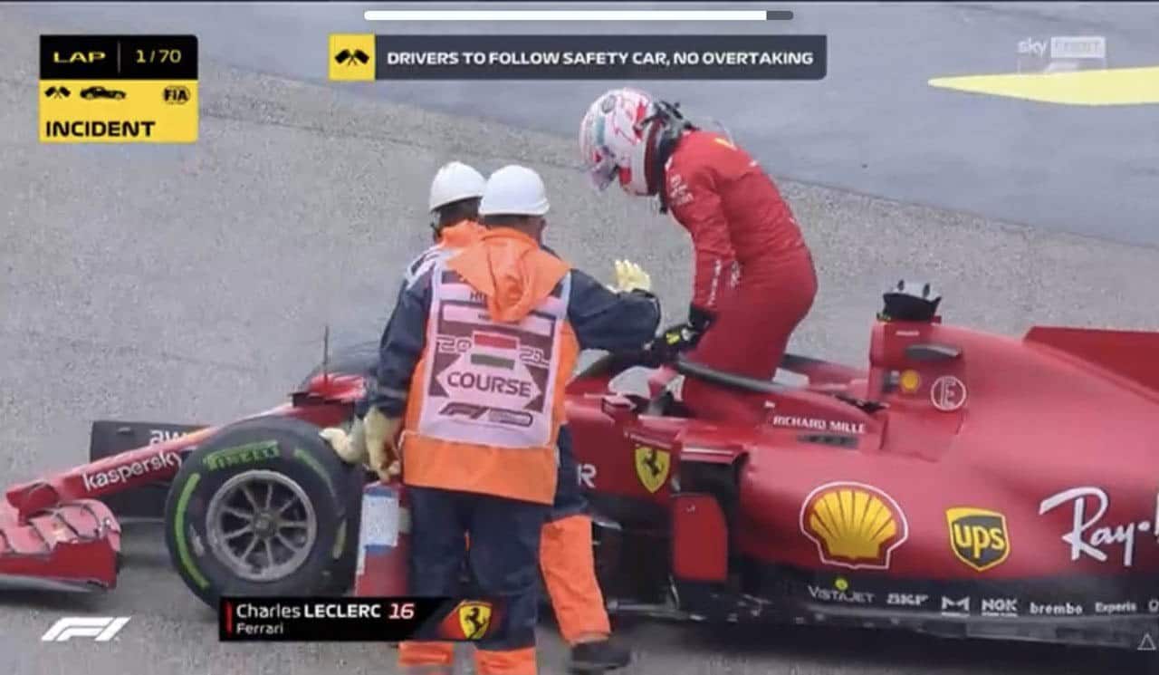 Finisce dopo appena due curve il GP di Ungheria di Charles Leclerc, ritirato dopo essere stato stato colpito dall'Aston Martin di Stroll e costretto a terminare la sua gara nella sabbia.