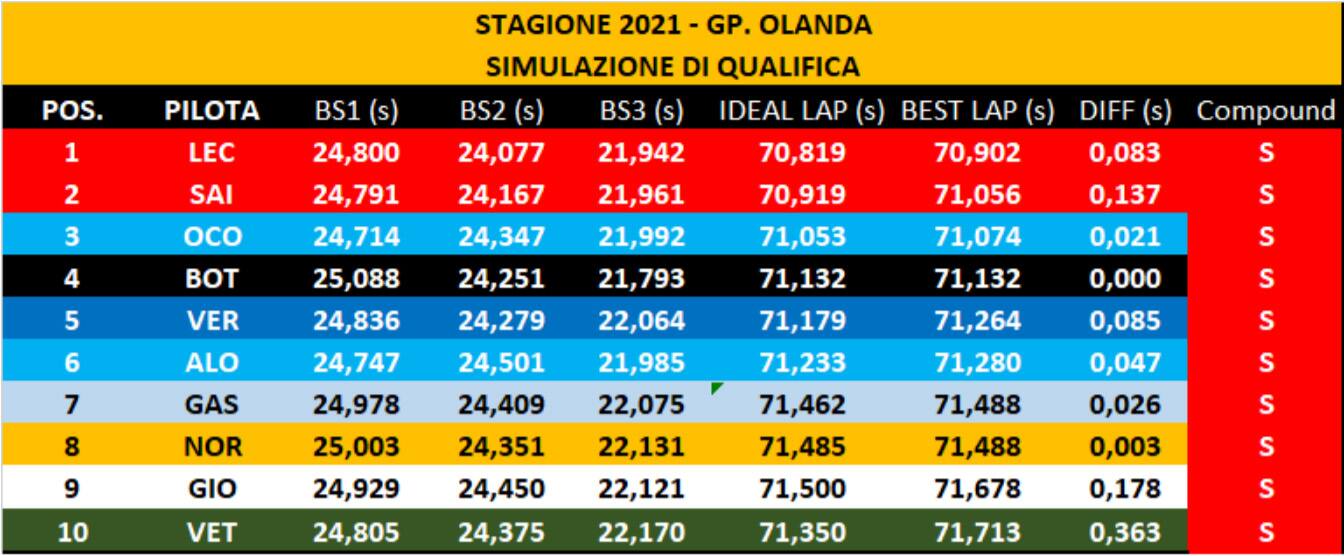 Se osserviamo i tempi possiamo notare che la situazione è molto più starndard rispetto a quanto avevamo visto in qualifica. Verstappen si è dimostrato molto veloce e costante con le rosse mentre Bottas ha faticato di più con il compound più morbido. Il pilota finlandese è andato decisamente meglio con le gialle anche se lo stint è stato molto corto per capire l’effettivo degrado di questa mescola. A parità di mescola soft la Ferrari è stata più lenta rispetto alla McLaren di Norris (3 decimi), all’Alpine (2 decimi). Se confrontiamo lo stint di Leclerc con Ocon, entrambi con gomme gialle, notiamo che la differenza a favore del pilota francese è si 2 decimi. Questo ci potrebbe indicare che il team di Maranello sta preparando molto bene la qalifica in quanto, come scritto sopra, potrebbe risultare fondamentale per il buon andamento della gara.