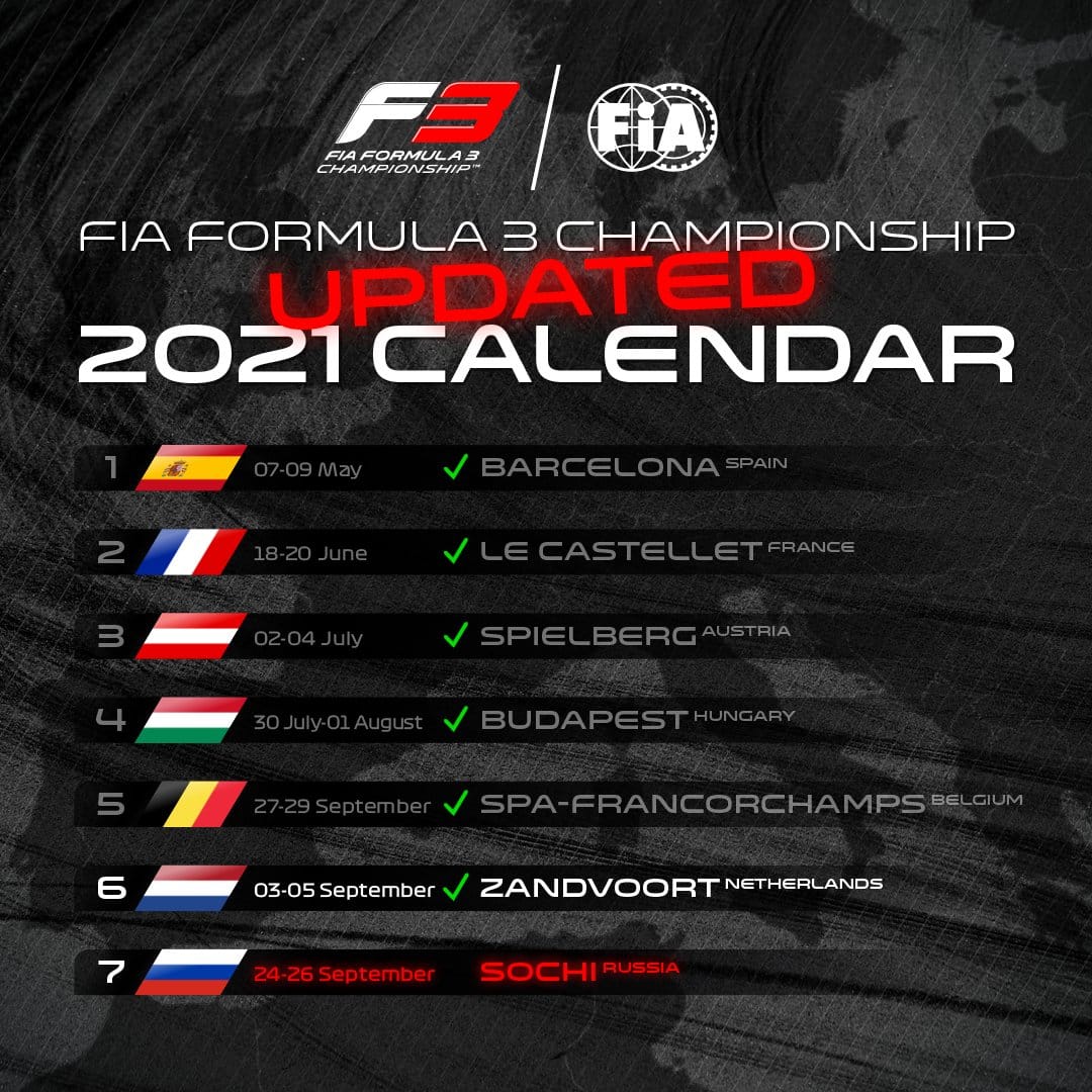 Il Campionato di Formula 3 si chiuderà il prossimo 24-26 settembre a Sochi. La gara in Russia sostituirà quella in programma inizialmente ad Austin, negli Stati Uniti. Ad annunciarlo sono state F1 e FIA. La modifica è stata approvata da tutti i partecipanti, anche per contenere costi e protocolli e non è legata in nessun modo al GP di Formula 1, che resta dunque regolarmente programmato ad Austin. In quel weekend sarà scorpacciata di motori, con le gare già in programma di F1, F2 a cui si aggiunge dunque quella di F3.