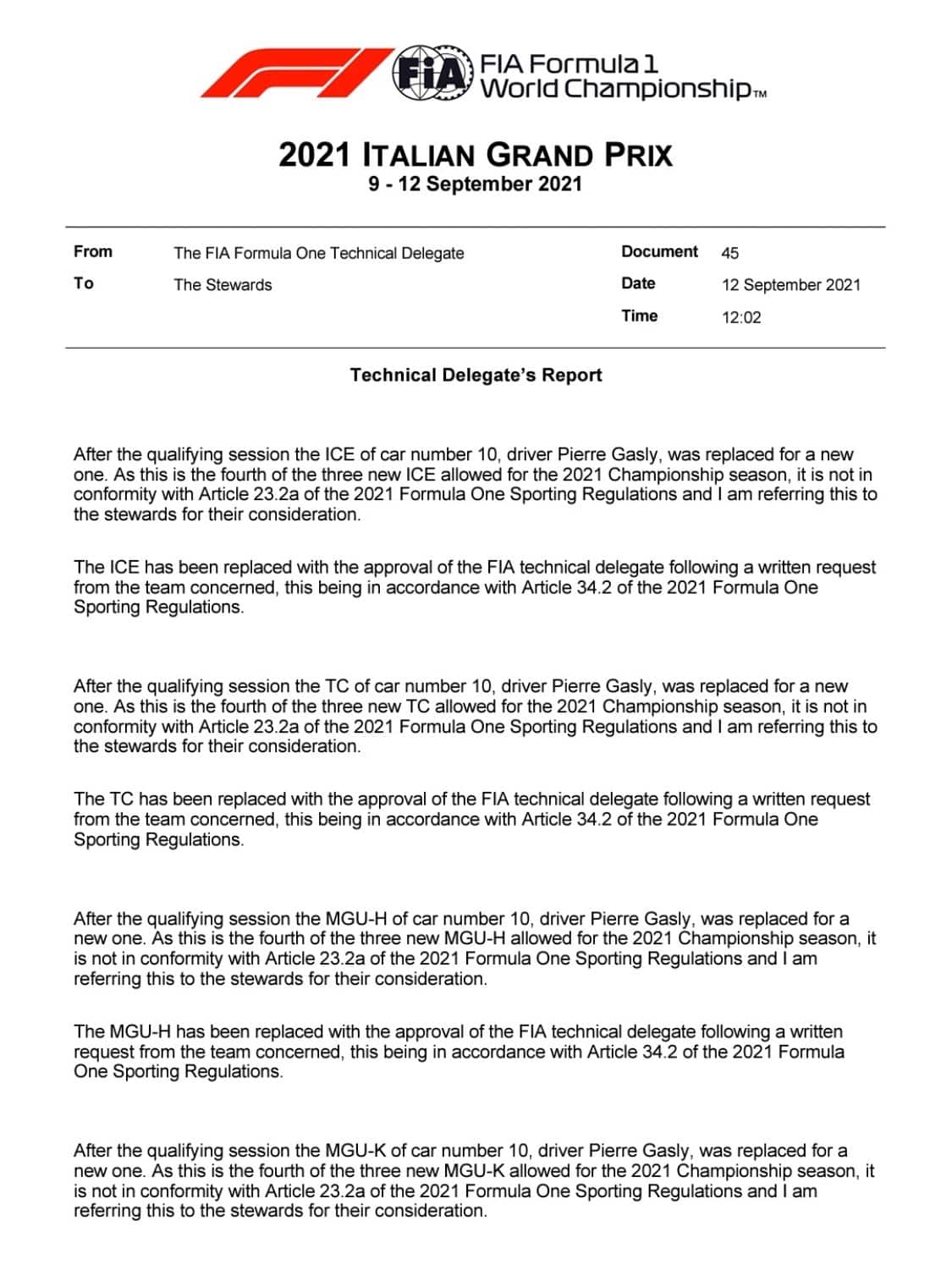 Dalla pitlane Pierre Gasly (Fra/Alpha Tauri): nuova power Unit e cambio per il francese. Nuove specifiche di batteria e set-up.