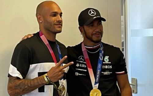 SPECIALISTI DELLA VELOCITA' - Lo sprinter azzurro Jacobs con il l'attuale campione di F1, Lewis Hamilton.