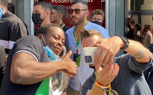IN TEMPO PER UN SELFIE - E' arrivato in ritardo rispetto agli altri azzurri, ma in tempo per un selfie. Ecco Fausto Desalu, oro nella staffetta 4x100 a Tokyo.