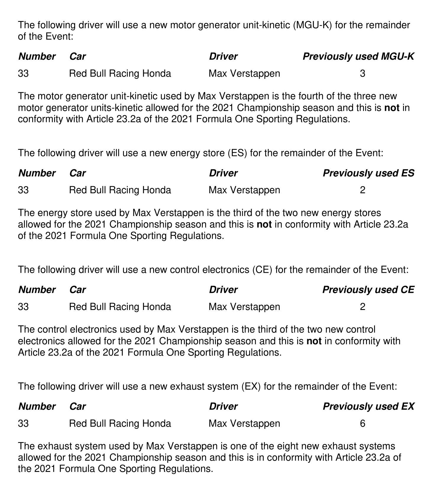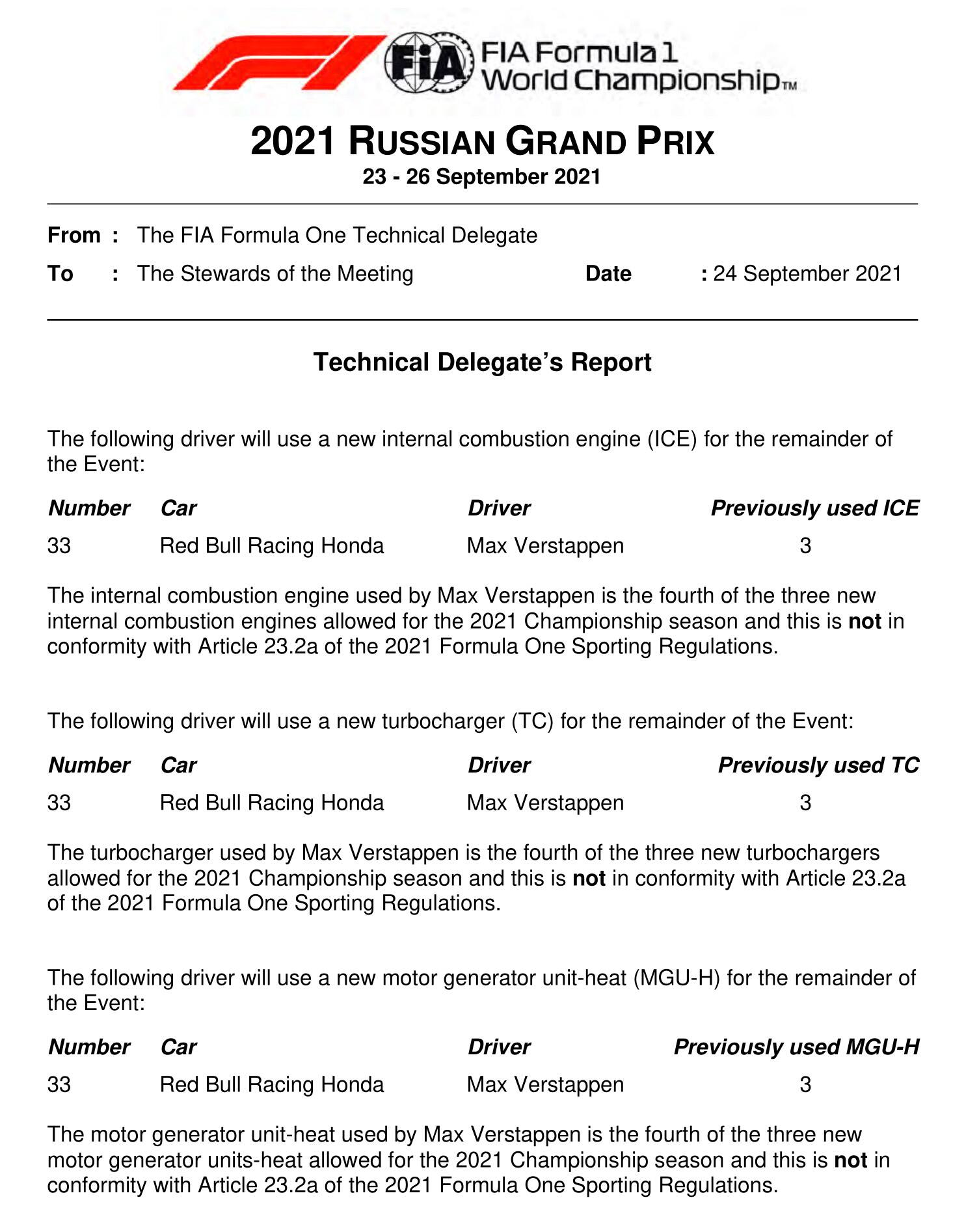 Max Verstappen partirà dal fondo della griglia domenica nel GP di Russia dopo aver cambiato e montato la Power Unit numero 4 sulla sua Red Bull. La notizia era nell'aria, è arrivata anche l'ufficialità nel corso delle FP2, con la comunicazione della FIA. Il leader del Mondiale, che avrebbe dovuto scontare tre posizioni in griglia a causa della penalità inflitta dopo l'incidente con Hamilton a Monza, partirà dunque in un'ultima fila stellare insieme alla Ferrari di Charles Leclerc.