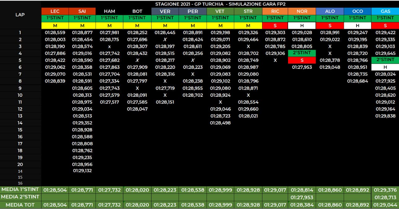 In casa Ferrari si sono avuti degli ottimi riscontri anche sul passo gara. Sainz, autore del long run più lungo, ha girato con un passo di 1:28,7 che, osservando quanto fatto dagli altri, è sicuramente un bell’andare. Buono anche il ritmo di Leclerc che ha girato sugli stessi tempi della Red Bull di Perez. La gara, se si disputerà su pista asciutta, sarà con molta probabilità su singola sosta. I top 10 cercheranno di qualificarsi con le medie per poi utilizzare le hard fino alla bandiera a scacchi. Chi partirà con le soft dovrà allungare il primo stint per poi cercare di utilizzare le hard fino alla fine.