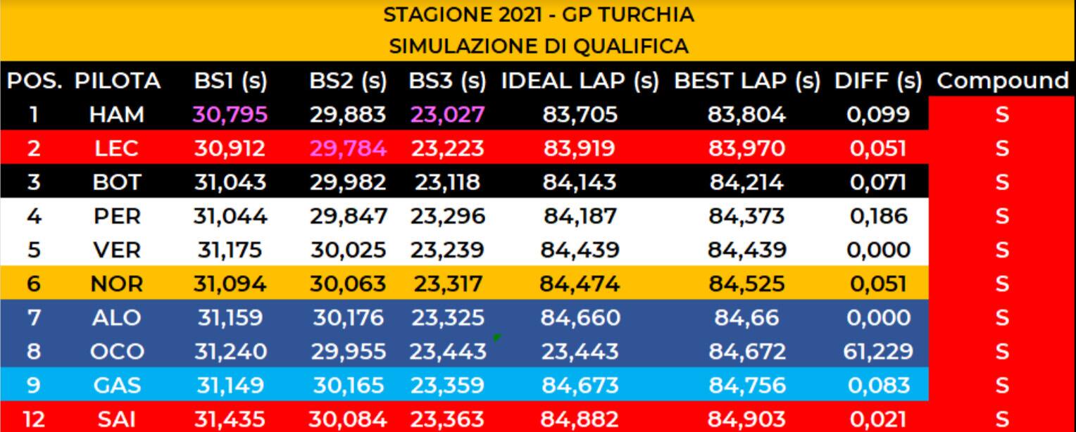Mercedes e sulle Red Bull mentre non si è notato sulla Ferrari che è stata, fin dai primissimi giri, molto veloce con le gomme “gialle”. Se osserviamo i tempi ottenuti nella simulazione di qualifica con gomme rosse possiamo notare che, Charles Leclerc, è vicinissimo alla prestazione ottenuta dalla Mercedes di Hamilton. Il pilota monegasco, autore del “best sector 2” è riuscito a sopravanzare Bottas e le due Red Bull.