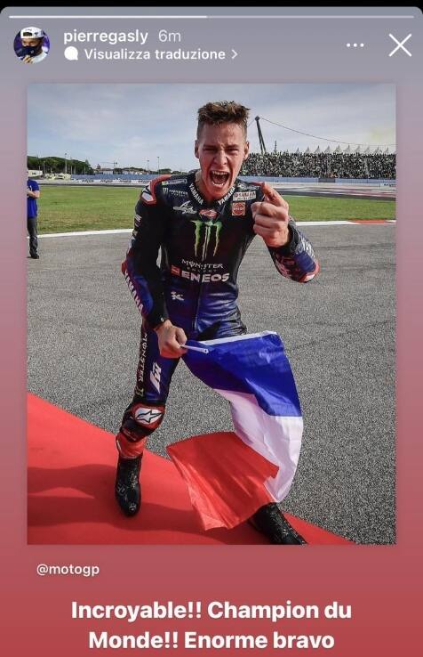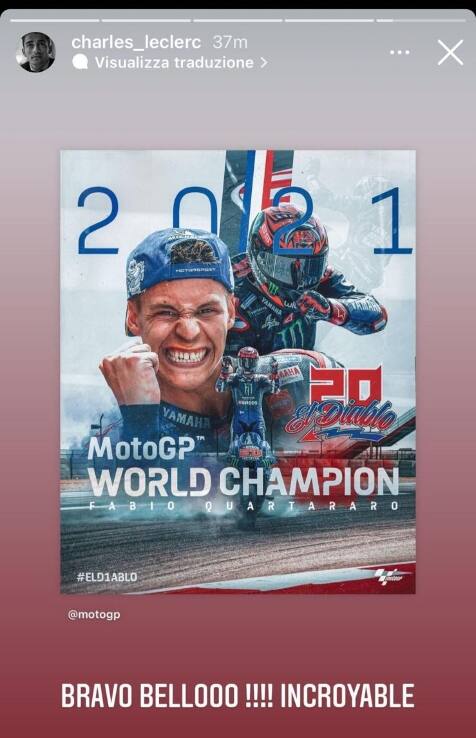 Il francese Fabio Quartararo è il campione del mondo della MotoGP. Il pilota della Yamaha celebrato anche dai colleghi della F1. Messaggi suoi social, anche in italiano, del connazionale Pierre Gasly e del monegasco Charles Leclerc. Poi sono arrivati anche i post di Ricciardo e Alonso. Stasera c'è la F1: si corre ad Austin, diretta Sky Sport F1, Sky Sport Uno e anche in 4K