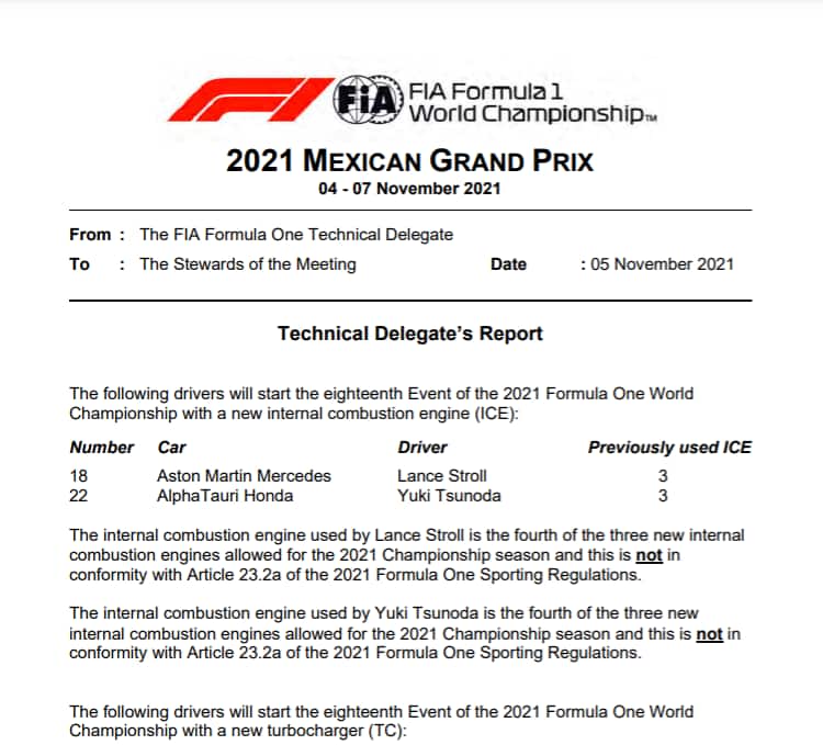 A Città del Messico, nel GP in programma domenica, scatteranno dal fondo della griglia Lance Stroll e Yuki Tsunoda. Come reso ufficiale dai comunicati FIA, sia il pilota dell'Aston Martin che quello dell'AlphaTauri hanno sostituito la Power Unit. Penalità anche per George Russell (Williams) dopo la rottura del cambio: per lui 5 posizioni in meno al via. Nel dettaglio: