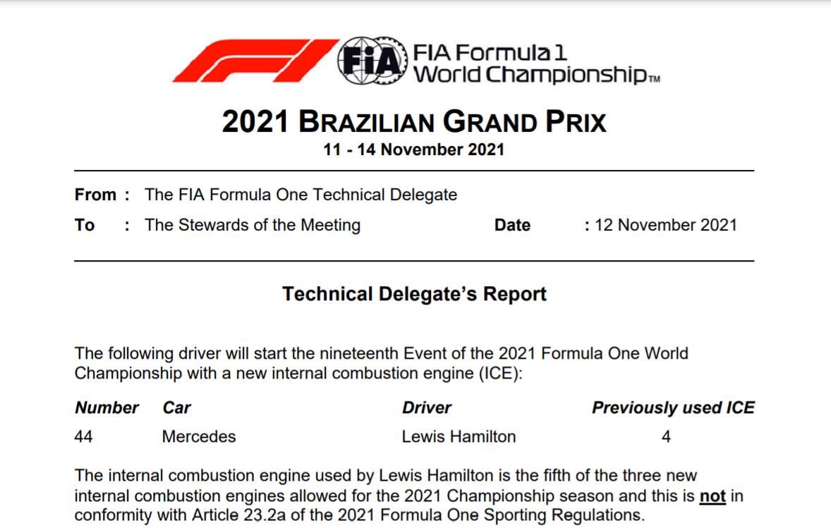 E' solo il venerdì di libere, ma in Brasile subito un colpo di scena. Lewis Hamilton dovrà scontare 5 posizioni di penalità nella griglia del GP a Interlagos per la sostituzione del motore endotermico. Si tratta della 5^ unità. Ha dunque prevalso la linea della Mercedes, che spingeva per il cambio mentre il pilota non era d'accordo. L'ufficialità è arrivata con un comunicato della Fia. La penalità verrà scontata non nella qualifica Sprint di sabato, ma al via della gara. Potrebbe essere un momento decisivo per l'assegnazione del titolo e la lotta con Max Verstappen.