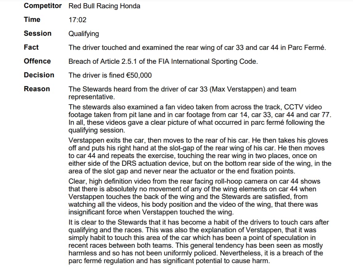 Osservando i video, gli steward hanno determinato che non c'è alcun movimento degli elementi che compongono l'ala posteriore della vettura di Hamilton quando vengono toccati da Verstappen e che la forza applicata da Max è "insignificante". Anche se questa pratica di toccare le vetture è ormai diventata abitudine, rimane sempre un'infrazione del Parc Fermé. Considerando che non è stato causato alcun danno diretto, si è optato per la multa.