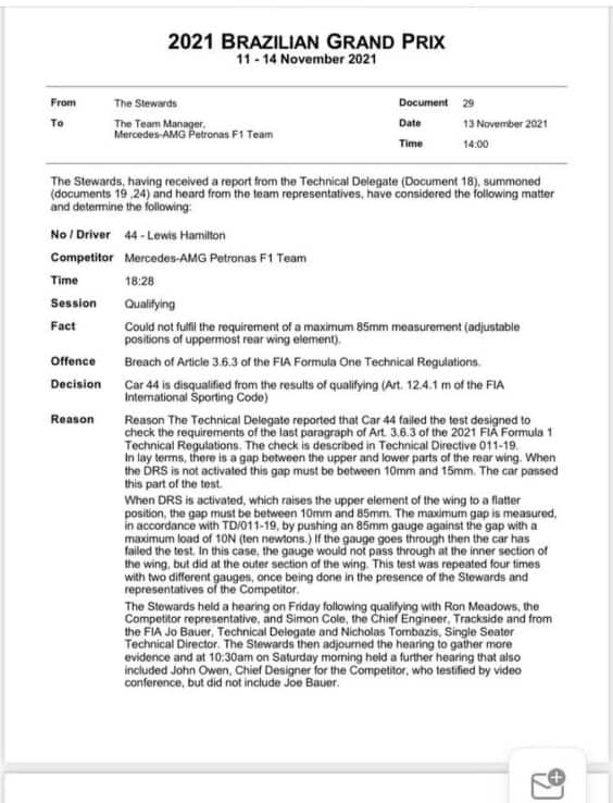 L'ala mobile della numero 44 (DRS) è risultata non conforme al regolamento tecnico. Il flap montato sull'ala posteriore della monoposto, che si spalanca per guadagnare velocità massima, nel caso di Hamilton ha presentato un'apertura maggiore di quella consentita dal regolamento. L'investigazione della FIA è partita attorno alle 23.15 italiane di venerdì, con la convocazione dei rappresentanti del team. La Mercedes numero 44 e l'ala contestata sono state tutta la notte sotto il controllo della Federazione. Il team di Brackley non farà appello.