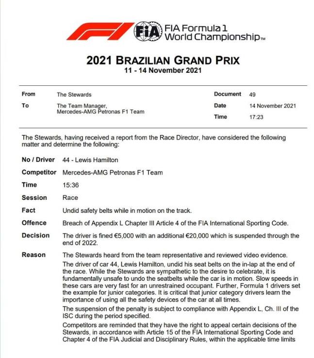 MERCEDESÈ successo al termine della gara vinta dal britannico della Mercedes in Brasile: sanzionato per esseri slacciato le cinture di sicurezza durante il giro di rientro ai box al termine della gara. Terza sanzione incassata nel fine settimana dopo la penalità nella griglia del GP e la squalifica dopo la qualifica di venerdì per irregolarità dell'ala mobile. La F1 torna la il 21 novembre con il GP del Qatar: diretta Sky Sport F1 (canale 207)