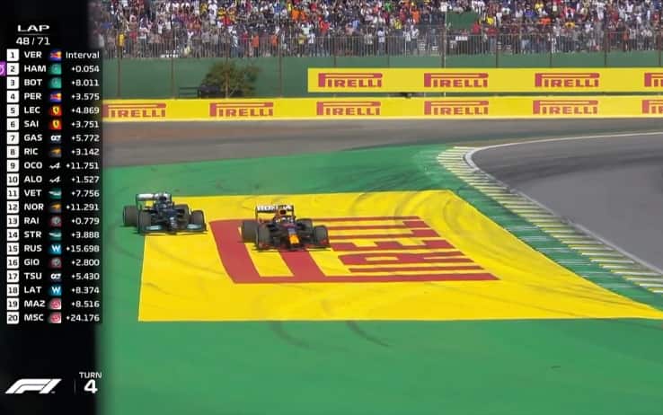 - Giro 48 del GP del Brasile: Verstappen va lungo difendendosi dall'attacco di Hamilton, entrambi finsicono fuori dalla pista.