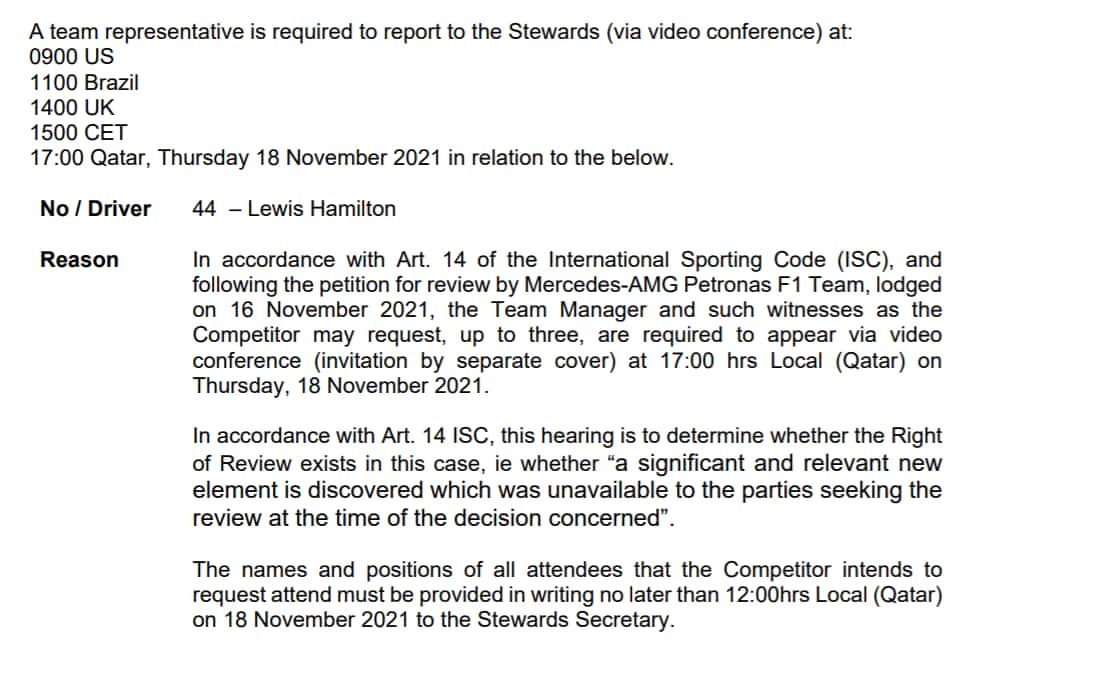- La Mercedes, portando nuove evidenze, ha deciso di esercitare il diritto di revisione in base all'articolo 14.1.1 del codice sportivo internazionale.