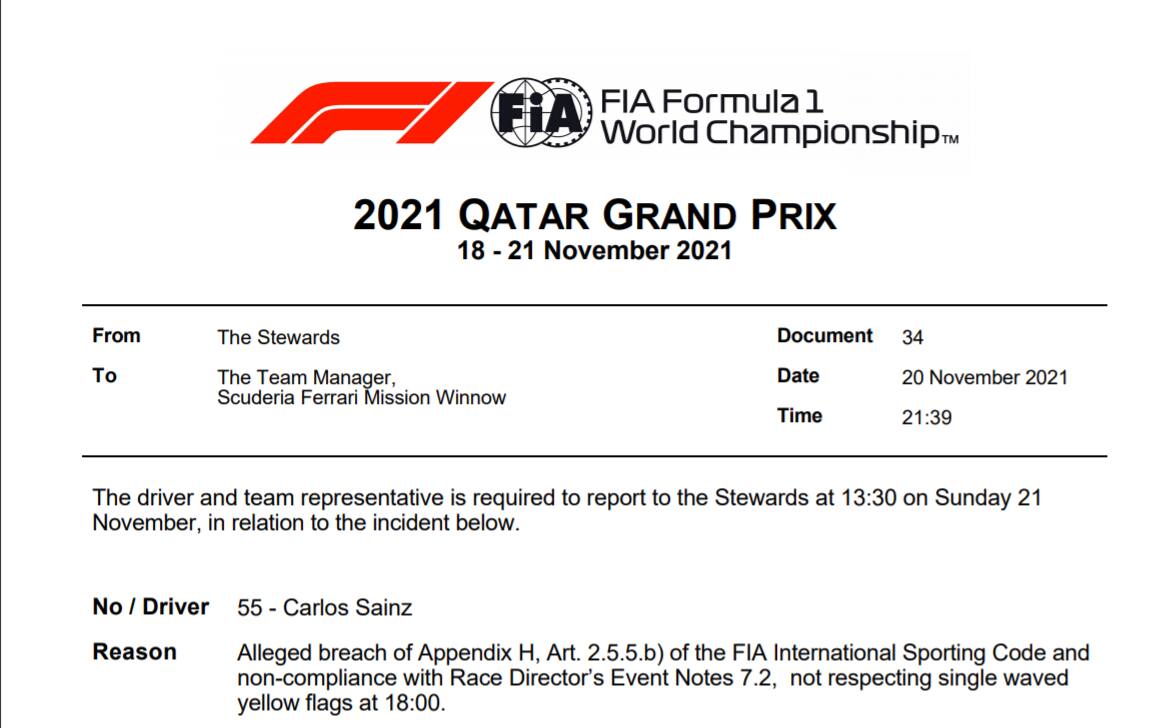 Per non aver rispettato la singola bandiera gialla, anche il ferrarista Carlos Sainz e Valtteri Bottas della Mercedes dovranno presentarsi domenica dai commissari.