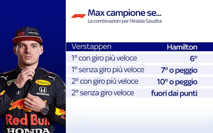 In Arabia Saudita Max Verstappen può già diventare campione del mondo. Impresa non impossibile ma difficile visto che Hamilton quanto meno dovrebbe restare fuori dai primi 5: le varie combinazioni di fatto sono realizzabili in caso di incidente o problema meccanico dell’inglese.
