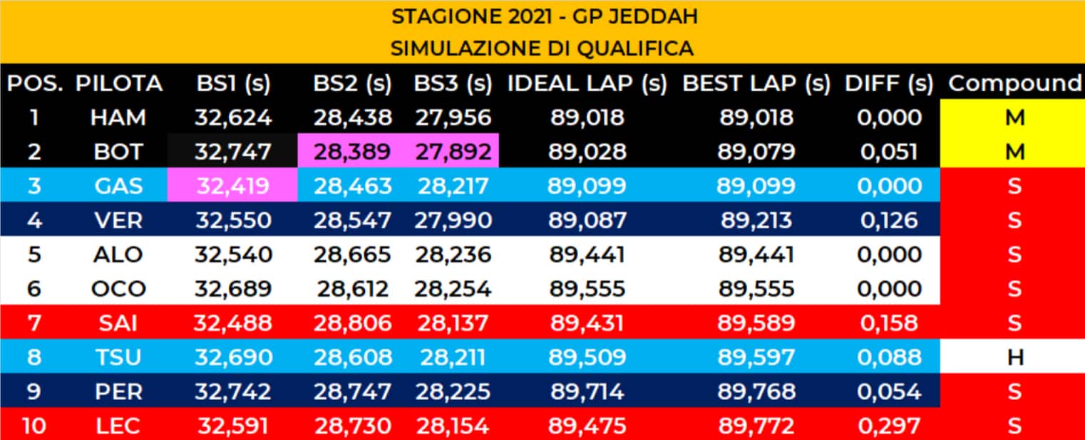 Se ci focalizziamo nella lotta per il titolo possiamo notare Hamilton e Verstappen a livello prestazionale sono stati molto simili. Se confrontiamo l’ideal lap di entrambi i piloti il gap tra i due è inferiore al decimo di secondo. Va comunque detto che, Verstappen è riuscito ad ottenere il suo miglior crono con la soft mentre Hamilton con la media. Mercedes ha sofferto di problemi di bassa temperatura con gli pneumatici più morbidi come ha ammesso alla stampa l’ingegnere capo Andrew Shovlin: “E’ stato un buon inizio per noi. La macchina sta funzionando bene. Stiamo ancora lottando con le gomme morbide. I nostri piloti non riescono a trovare il grip che desiderano. Abbiamo ancora del lavoro da fare in questo senso. Dobbiamo mettere a punto la macchina per il giro da qualifica per essere pienamente soddisfatti del nostro lavoro”. Secondo Pirelli, se il grip non aumenterà a dismisura rispetto a quello riscontrato oggi, la differenza tra le due mescole è moto bassa e quantificata in circa 2 decimi al giro.