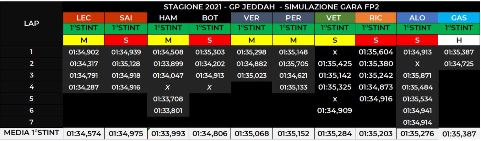 Se analizziamo il passo gara possiamo notare, senza dubbio, il ritmo che è riuscito a tenere Hamilton che è stato l’unico pilota a scendere ben 3 volte sotto il muro del minuto e trentaquattro. Il compagno di squadra, con gomme soft, ha pagato 1 s al giro come ritmo e questo ci fa capire quanto la Mercedes preferisca la mescola media rispetto alla soft. Per quanto riguarda Verstappen i suoi tempi non sono stati rappresentativi. Il suo passo è stato decisamente più lento rispetto a quello della Mercedes e questo ci fa capire che non ha spinto la sua RB16B al 100 % delle sue possibilità. La Ferrari, in condizione di gara, è stata veloce con entrambe le mescole e questo ci fa capire che, con una buona qualifica, il team italiano ha la possibilità di raccogliere un buon bottino di punti nella gara di domenica.