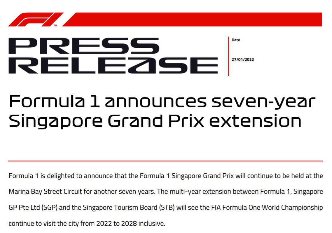 Mentre la Formula 1 si preparara ad alzare il sipario sulla stagione 2022, arriva un'importante notizia che riguarda una delle tappe del calendario. E' stato infatti ufficializzato un nuovo accordo con Singapore: il Mondiale sarà dunque al Singapore Street Circuit per i prossimi sette anni.