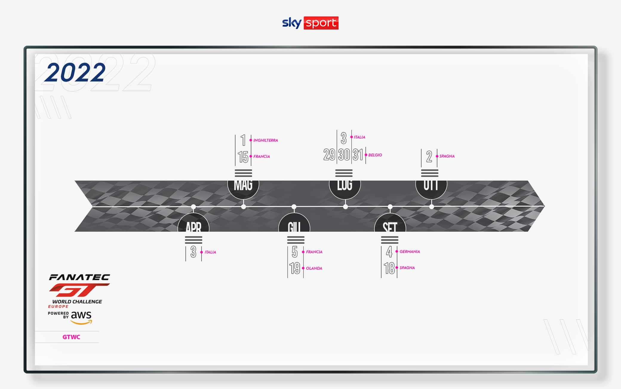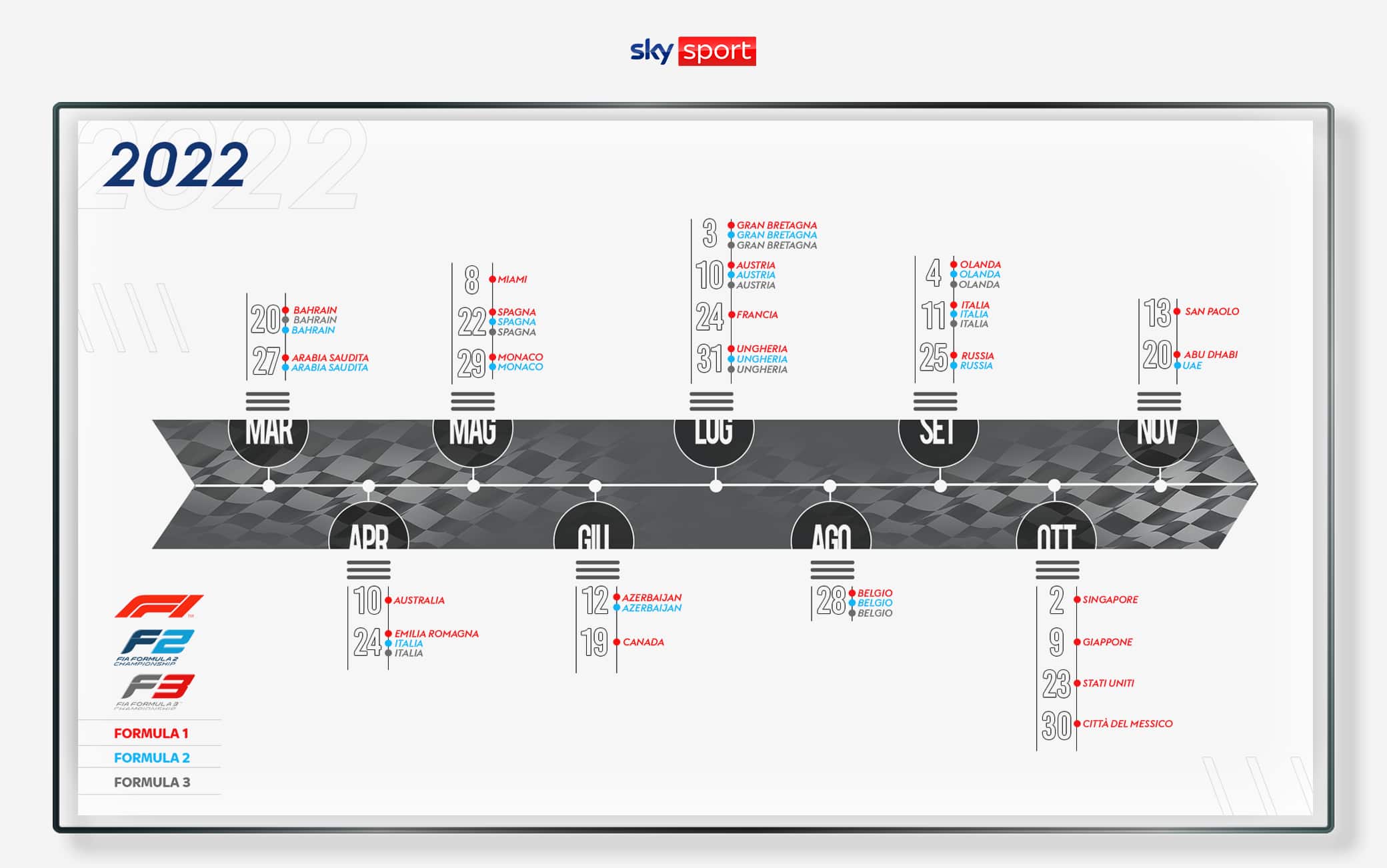 Senza dimenticare i campionati di F2, F3, Ferrari Challenge e Porsche Supercup per le quattro ruote, oltre ai campionati di Moto2, Moto3, MotoE, FIM Junior GP, CIV e Rookies Cup per le due ruote.