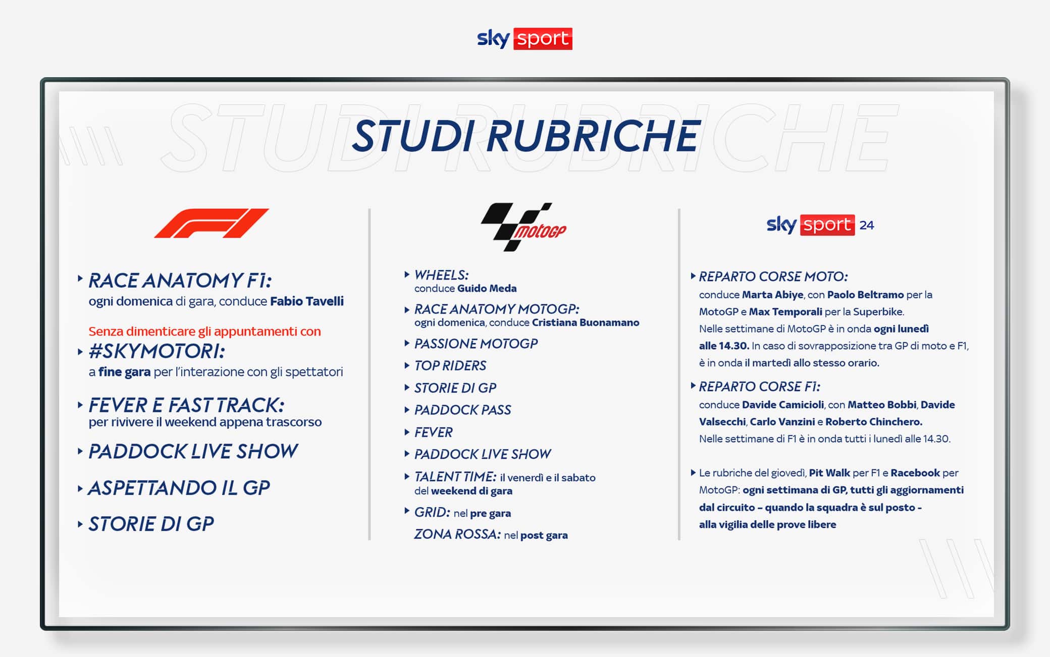 - Reparto Corse: condotto a rotazione da Marta Abiye, Dario Nicolini e Davide Camicioli. Nelle settimane di GP sarà in onda per ben tre giorni, dal lunedì al mercoledì, con delle novità: con l’ampliamento dell’offerta motori di Sky, i temi affrontati insieme agli ospiti nel corso delle puntate saranno più ampi e andranno a toccare tutti i campionati, oltre i mondiali di F1 e MotoGP.
