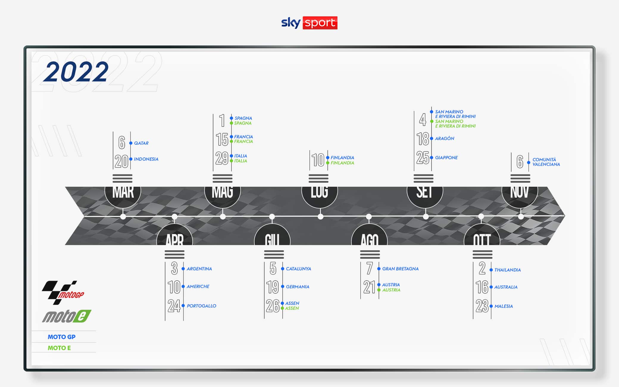 Dopo il via al Mondiale di Formula E (9 Round in tutto, raccontati da Ivan Nesta e altre voci tecniche a rotazione) e il debutto su Sky del Mondiale rally WRC (13 Round in programma nella stagione in corso, con le voci di Lucio Rizzica e Rosario Triolo, insieme ad alcuni dei nomi più importanti del movimento rallistico italiano che si alterneranno al commento tecnico), il 6 marzo torna anche la MotoGP con il Gran Premio del Qatar, mentre il 20 marzo toccherà alla Formula 1 con il Gran Premio del Bahrain. Fino al 20 novembre, saranno 23 i GP in calendario per la F1 (5 di questi – Imola, Spagna, Francia, Monza e Stati Uniti - in diretta anche su TV8), 21 quelli di MotoGP (6 di questi – Stati Uniti, Spagna, Italia, Germania, Misano e Aragón – live anche su TV8) e 12 i Round delle 3 classi di Superbike (SBK, Supersport e Supersport 300) al via il prossimo 10 aprile in Spagna, con il Mondiale SBK in diretta anche su TV8 e raccontato da Edoardo Vercellesi e Max Temporali.